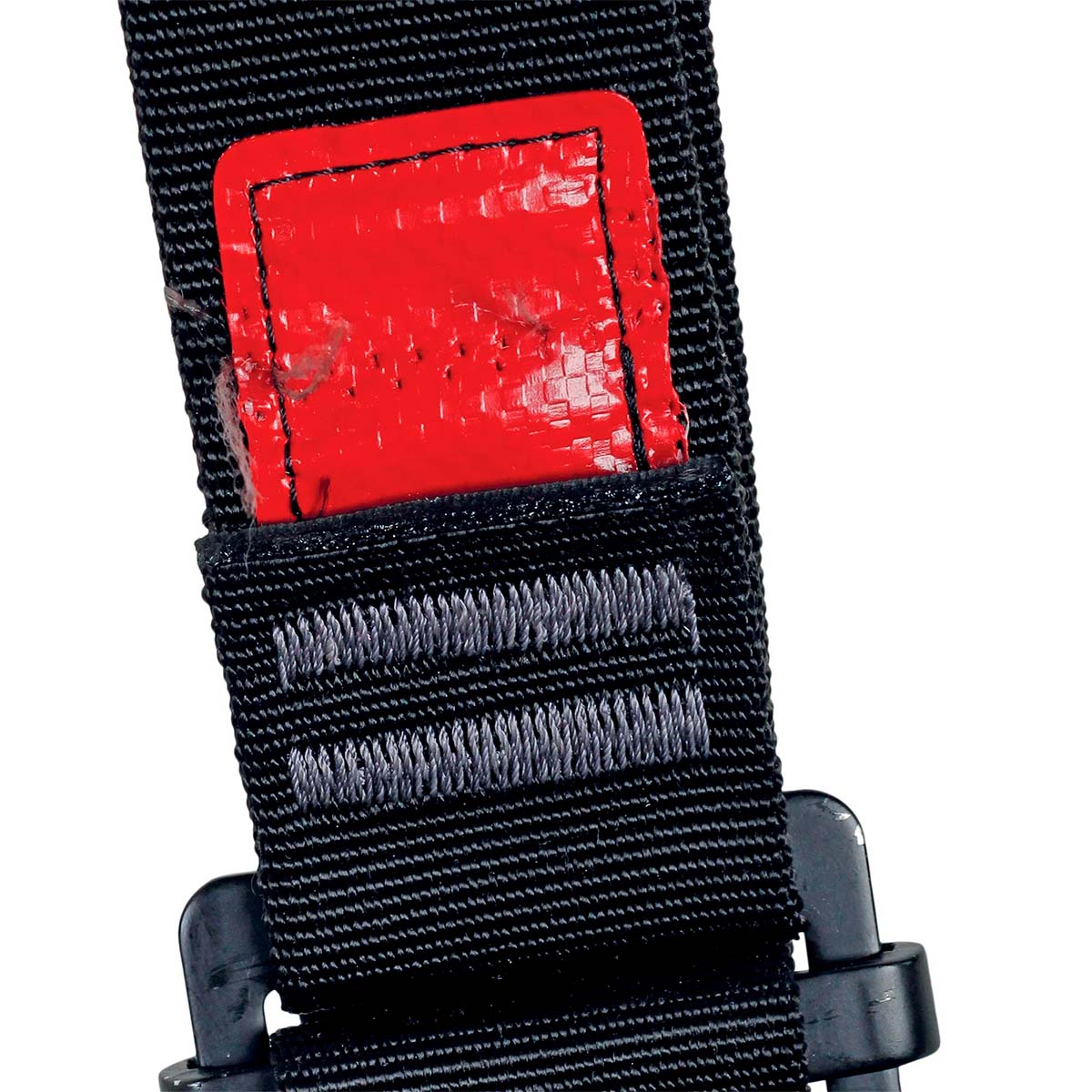 - Para una fácil inspección, el arnés está equipado con un indicador de caída en el área del punto de fijación de la espalda que se activa como resultado de una caída, una etiqueta roja indica que el arnés debe retirarse
